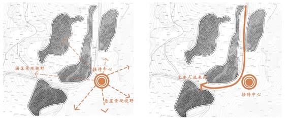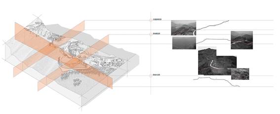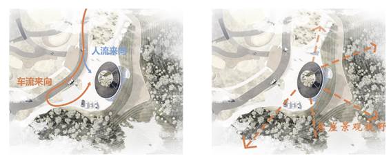 从场地剖面来看,场地南北地势中间高,两边低,两侧都有较好的视线,东西向位于一段陡崖的顶端,场地下方还有一段小的观景平台。