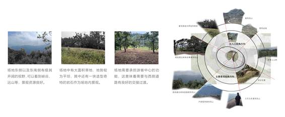 场地位于一个临山崖的平台,有270°的观景视角,北向为主要的人流来向。场地东面可远眺苍茫的群山与深邃的峡谷,南面可俯瞰山林,听涛林海,西面则可一览石龙头营地,北面为自然草坪可供游客席地休闲。