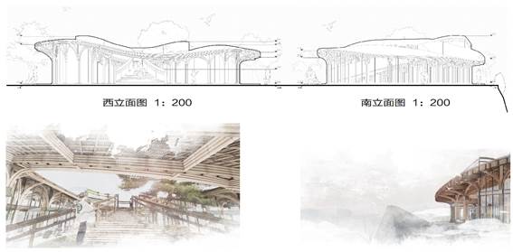 这是主入口方向看到的主要立面,云梯就像一个张开的怀抱,迎接着每一个到来的游客。从南立面设计团队可以看到建筑与巨石的关系,站在云廊檐下,与巨石对饮。
