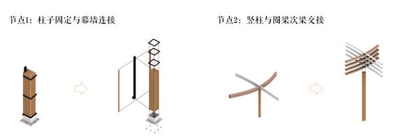 关于建造节点,柱子与玻璃幕墙如何连接,设计参考了竹境公司已有的案例,将成束的柱中减去两根,在其中嵌入金属框架,再以两根竹子负于两边,将其隐藏起来,两个方向的梁相接处也是已有比较成熟的做法,可以通过类似井干的榫卯结构进行交错。