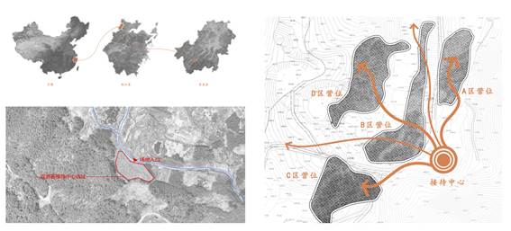 项目位于安吉县屳(仙)居石龙头露营公园入口,是整个营地的接待中心,为营地提供接待登记、售卖展示、医疗等服务。场地流线上,游客们会先在游客中心集中,然后分散到各个营地。