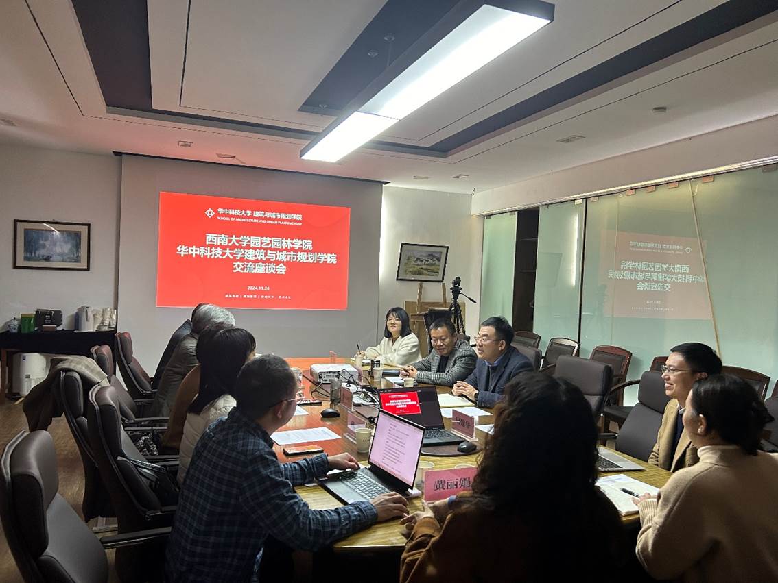 2024年11月26日,西南大学园艺园林学院潘玉锋党委书记、周建华副院长、秦华教授、风景园林系杜文武主任、张子昕教授和张靖悦组织员一行来我院访问调研。我院李小红党委书记、谭刚毅院长、景观学系万敏教授、戴菲主任、赵纪军副主任、徐利权副主任、黄丽娟组织员参加会议交流。