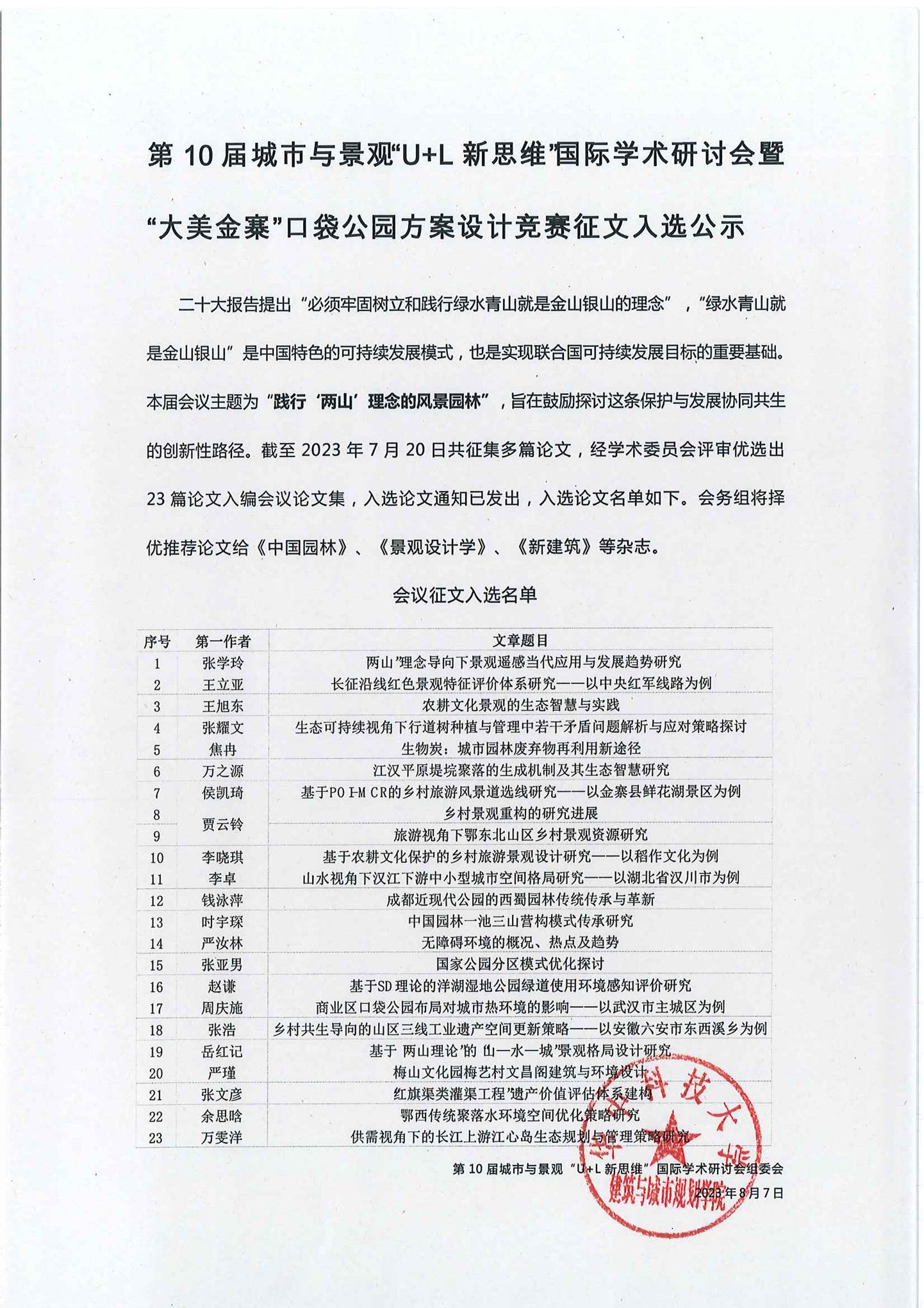 第10届城市与景观“U+L新思维”国际学术研讨会暨“大美金寨”口袋公园方案设计竞赛征文入选公示