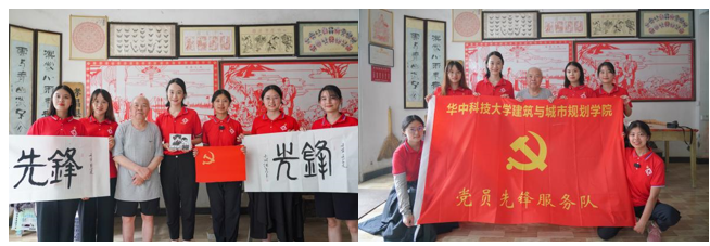 何立群老师带着队员们到湖北省非遗传承人张玉义老先生家拜访。张老说:"打小就生活在小河,在党的关怀下,我们的生活越来越好。现在是以往从未有过的最好的时代,我希望可以通过'红色剪纸'传达我对党对祖国的热爱,也希望吸引更多年轻人关注剪纸技艺,把它一直传承下去。"