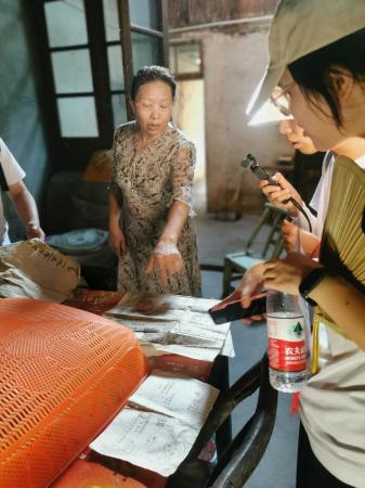 在特色老铺子里,居民们生动地讲述着古街昔日的繁华,仿佛带大家回到了过去。"筛选出好的竹节后,把竹经篾沿着木制的模具穿插编织,最后收尾锁口就行了。"竹篾鱼篓店的店主热情地讲述着竹篓制作工艺。队员陈心愉细细琢磨着形式各异、做工精致的编织品,赞叹不已。看到如今古街已不复当年"小汉口"的盛景,她感慨道:"这次调研让我看到了许多精致的手工艺品,我希望可以发挥专业特长,把它们改造成当下流行的样式,比如鱼篓灯,吸引更多人的关注。"