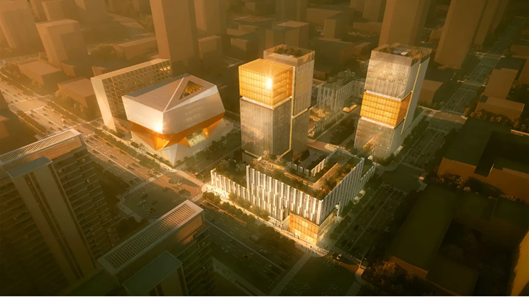 整个电竞中心项目以“光之谷,晶之城”为主题,提出“活力之源、能量之塔、电竞之晶、乐玩之城”四大主题亮点,以电竞馆为核心,打造场馆——产业一体化的活力聚落。电竞主场馆以连续折面隐喻电竞能量水晶与链接网络,寓示光谷产业基地以“电竞水晶”为核心,不断迸发新的能量链接世界、链接未来。