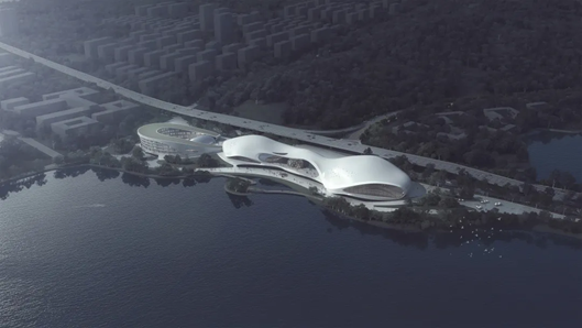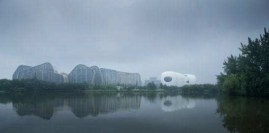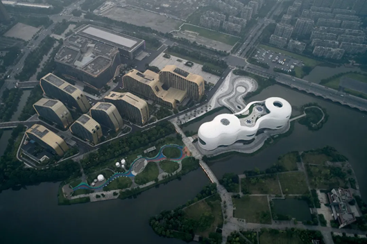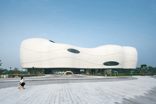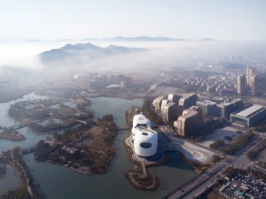 项目是国内规模最大、展品最丰富的专业动漫博物馆。博物馆位于杭州白马湖中的一个小岛上,建筑底层架空,形成容纳人流的半室外空间,与周边自然山水环境和谐共生。同时与比邻的会展中心建筑群保持友好,形成“云”与“山”相依相随,相互呼应的整体形态。