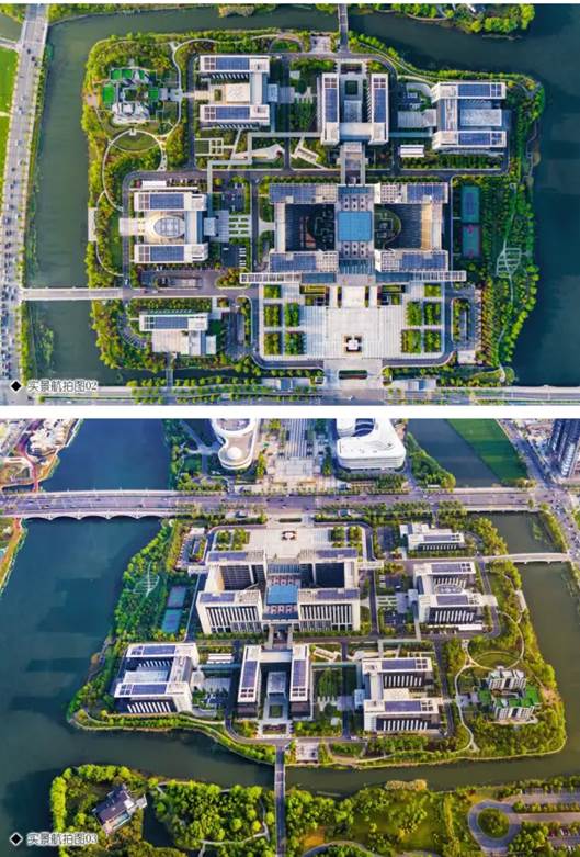 基地位于新城核心区中轴北端,北部紧临梅山及国家湿地。虽上位规划在周边布局了塔楼及巨构群,且国内中轴尽端办公楼多以大体量压轴,但按规划师“上帝视角”审视区域后,本案反其道行之:以化整为零迎合湿地斑块;以U形院落面向景观开放,使建筑与环境得以和谐共生。
