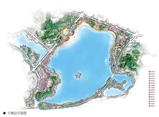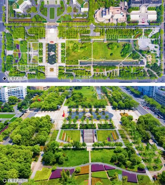 以中式线描手法,腹地留白、南北着墨,从周边需求入手,在闹市区营造春意盎然:除市政府南部克制性设中轴外,其余皆为休憩功能;与四周道路密接的纵横园路,增加了场地的可入性;景观开闭、场地闹静、地坪软硬与周边的道路等级、人流强度互动。