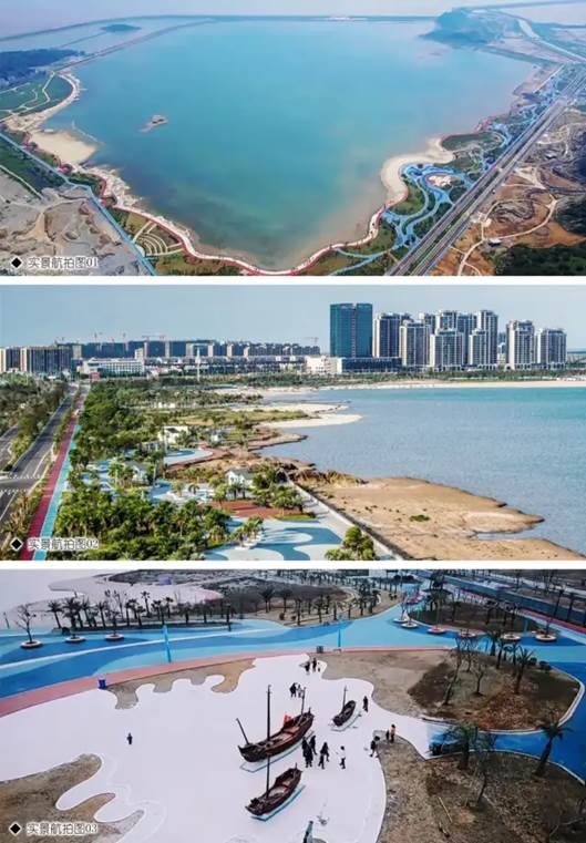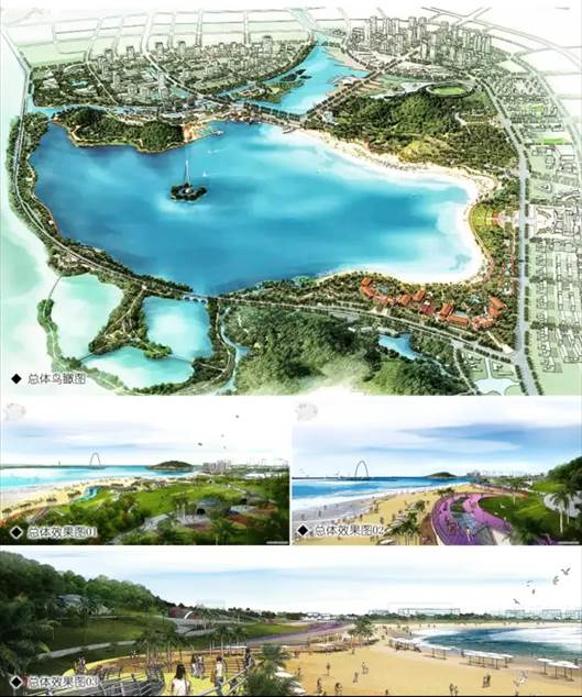 从局部与整体、视点与对象入手,以大地景观手法,营造多样性、趣味性兼具的五湾景区;景观师与规划师互动,岸景的定位、开合与周边功能、人流相融;通过路堤结合、分池沉沙、填沙营岸创造蓝色海洋,在黄水泥滩的浙东南实现了蔚蓝海岸新城,践行了城市设计的构想。