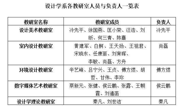 我院艺术设计专业下设设计美术、室内设计、环境设计、数字媒体艺术、设计学理论等5个教研室。各教研室人员与负责人安排如下: